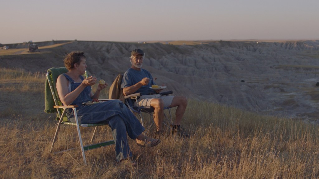 Fern, a recently-widowed woman who’s abandoned her old life to travel the country as a nomad, meets people similar to her, taking small jobs wherever she can. We meet Swankie, who teaches Fern a variety of things that everyday nomads ought to know. Fern also bonds with fellow nomads (most of whom are played by non-professional actors, real members of the nomad lifestyle), including Linda May, Bob Wells (an American vandweller who lectures others on a minimalistic and nomadic lifestyle) and Dave (David Strathairn), another fellow nomad who presents himself as a potential partner, a means to settle down again.